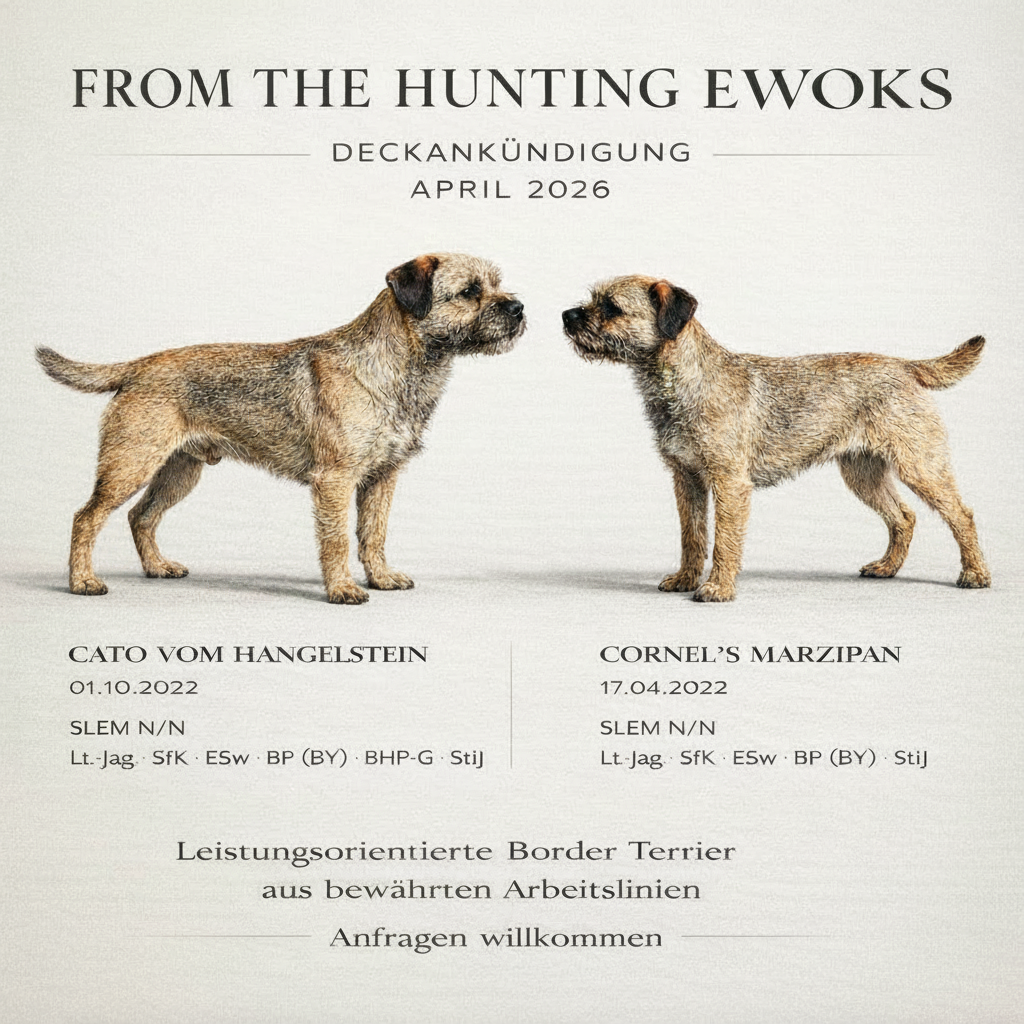 Mit ihren bestandenen Leistungsnachweisen – darunter Lautjagd, Stöbern, SfK, ESw, Brauchbarkeit (BY) und Stj – verkörpern Cato und Marzipan genau das, was wir in unserer Zucht from the hunting Ewoks anstreben: